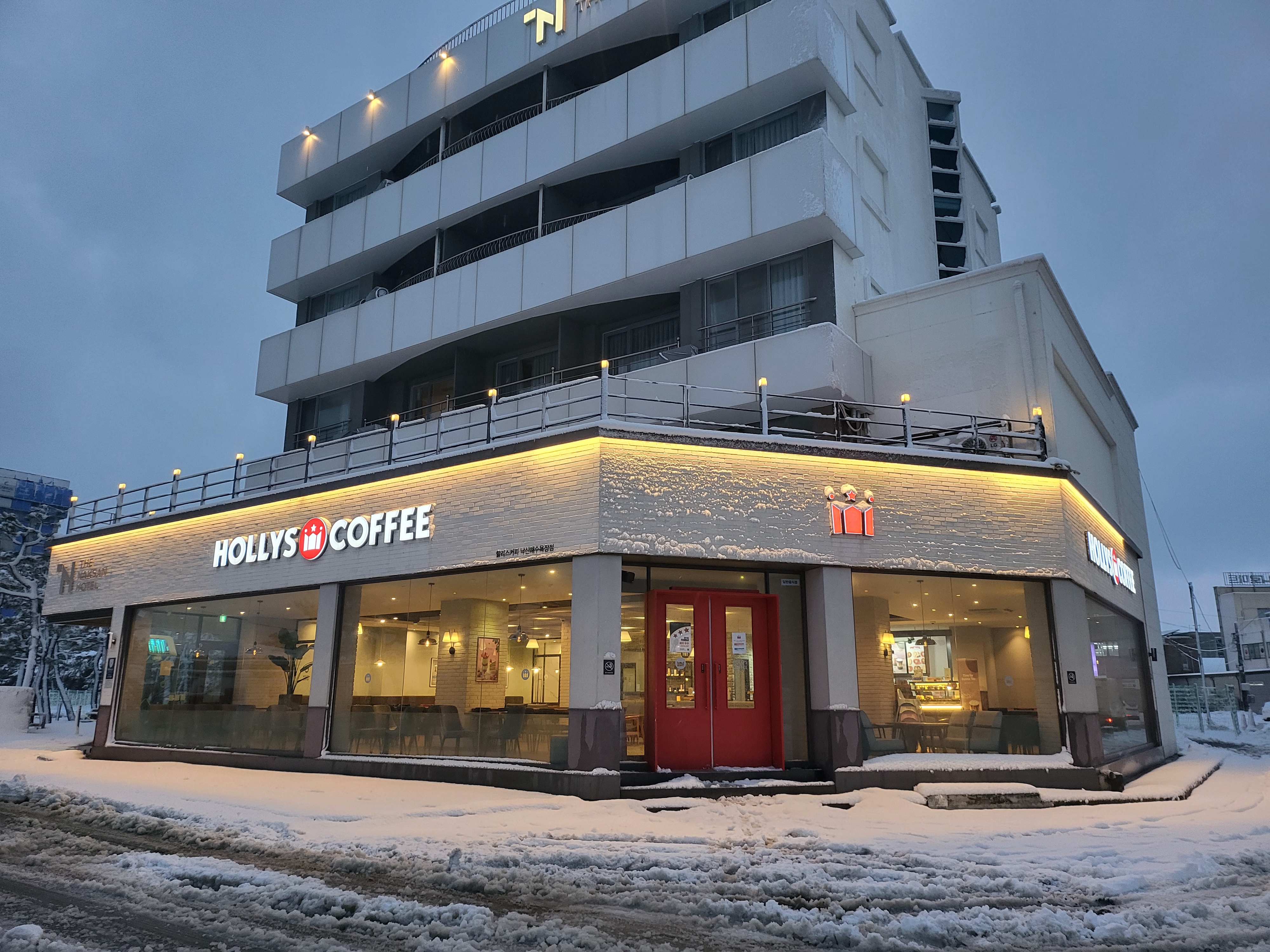 강원 양양군 강현면 해맞이길 18 에 위치한 할리스커피낙산해변점은 낙산해변에서 바다와 가장 가까운 커피전문점입니다. 커피가 맛있는 할리스커피낙산해변점에 함박눈이 쌓여 더욱더 운치있습니다.