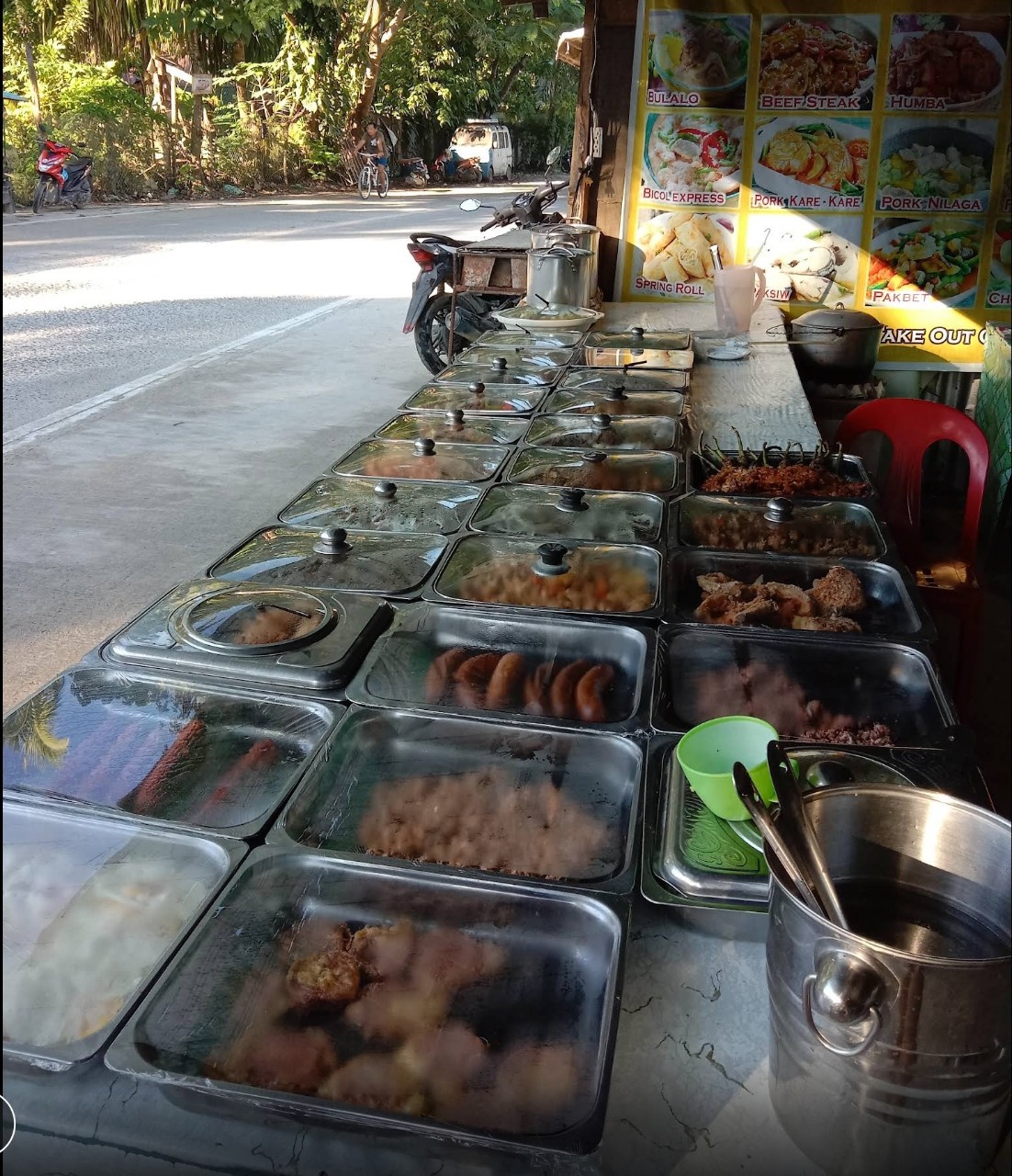 필리핀 현지 음식을 체험하고 싶다면 이곳을 강하게 추천합니다. 새벽 4시반의 첫 강습을 2시간 받고 리뷰가 끝나고 나면 바로 달려갔던 현지 맛집입니다. 원하는 반찬을 얘기하면 접시에 담아주고 먹은 만큼 계산하는 방식으로 보통 3-4가지의 반찬에 밥을 먹으면 150페소에서 250페소 한국돈으로 약 3,500원에서 6,000원 정도 나오는 저렴한 현지식당입니다.