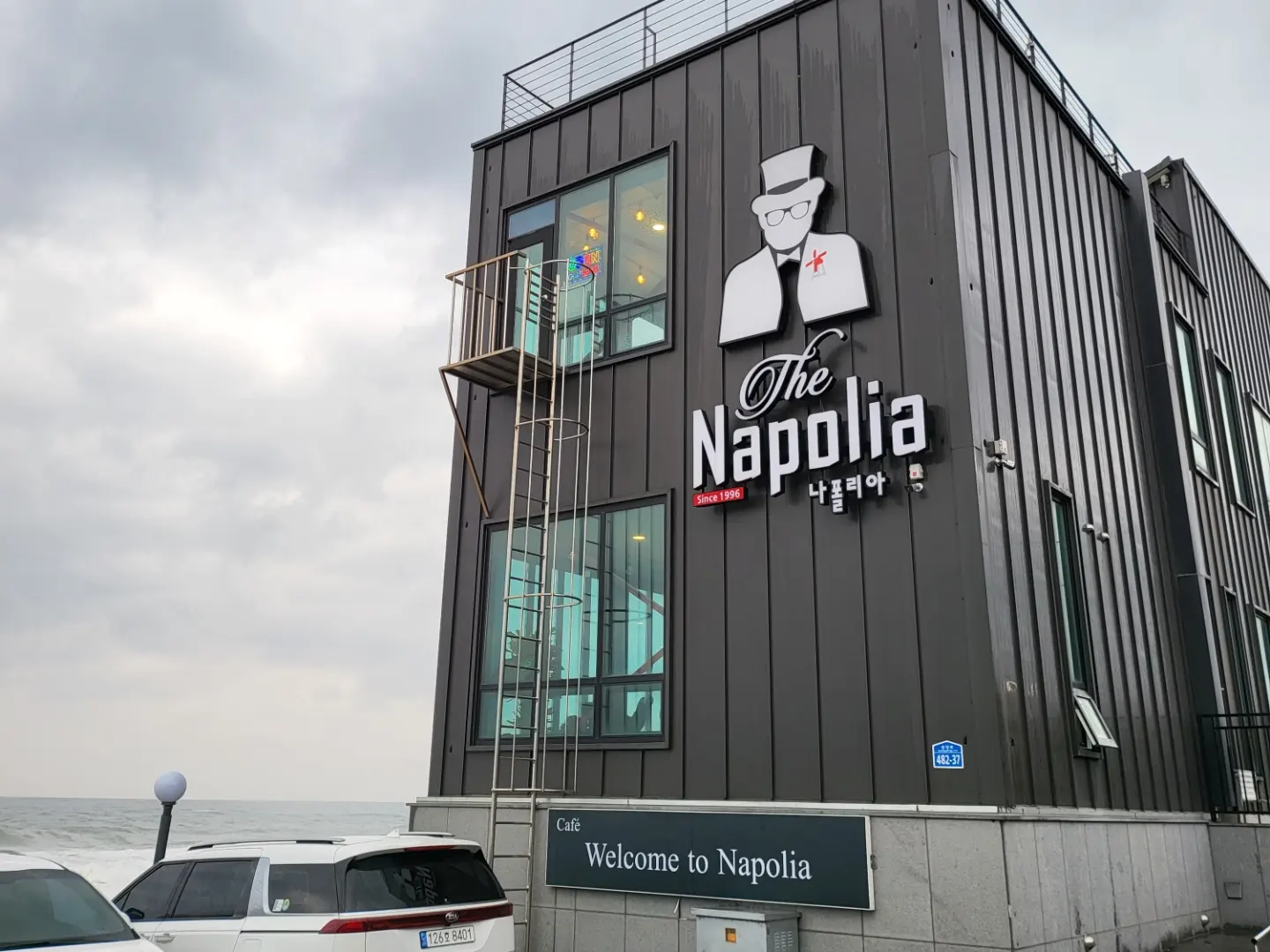 이 카페에 가면 커피를 주문하고 기다리는 동안은 1층의 창가에 놓인 테이블에 앉아 파도를 내려다보고, 주문한 커피가 나오면 지하로 내려가 파도와 가장 가까운 자리에 앉는다. 이 카페의 지하층은 통창으로 되어있고 밖으로 나갈 수 있어 커피를 마시다가 바람을 쏘이러 나가기도 하고 따듯한 자리에서 바다 물멍을 하기도 한다. 이곳을 방문하는 사람들은 1층이나 2층에 자리가 없을 때만 지하층으로 내려가는데 우린 가장 먼저 찾는 자리가 지하층이다. 커피 맛은 콜롬비아의 노말 한 커피맛이고 빵은 직접 굽지는 않는 것 같다.
