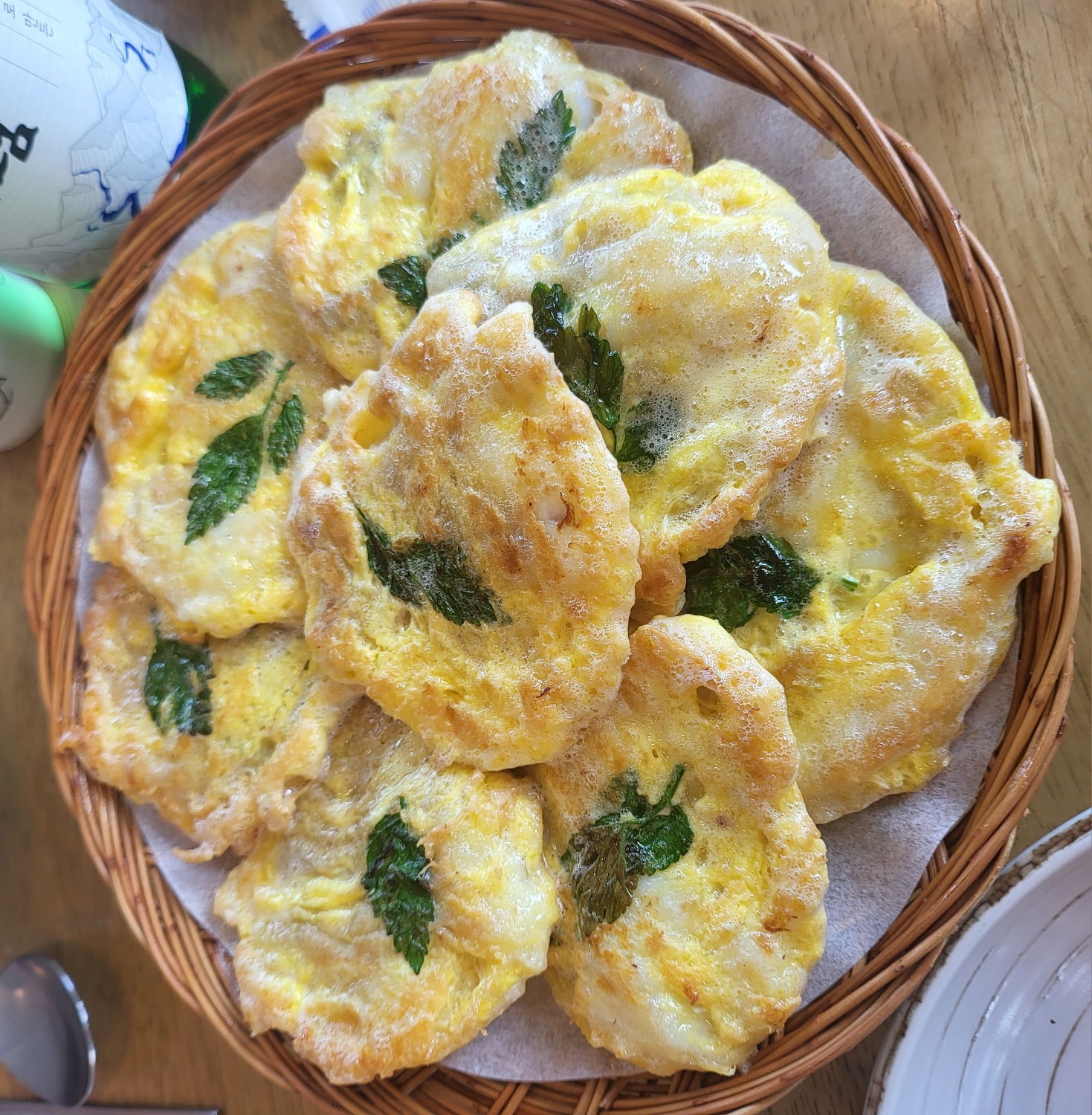 생대구전은 두툼하게 포를 뜬 하얀 생선을 밀가루와 계란에 입혀 미나리로 고명을 얹힌 노르스름한 색감과 방금 부친 기름의 보글 걸임까지 식욕을 자극했습니다. 전의 비주얼을 더해 주는 바구니 세팅으로 나왔고, 첫 한입을 깨물자마자 다 같이 터지는 소리 "와우, 맛있다"였습니다. 이 생대구전에 간장대신 청어알 젓갈을 올려서 먹으니 또 다른 맛을 느낄 수 있었습니다.