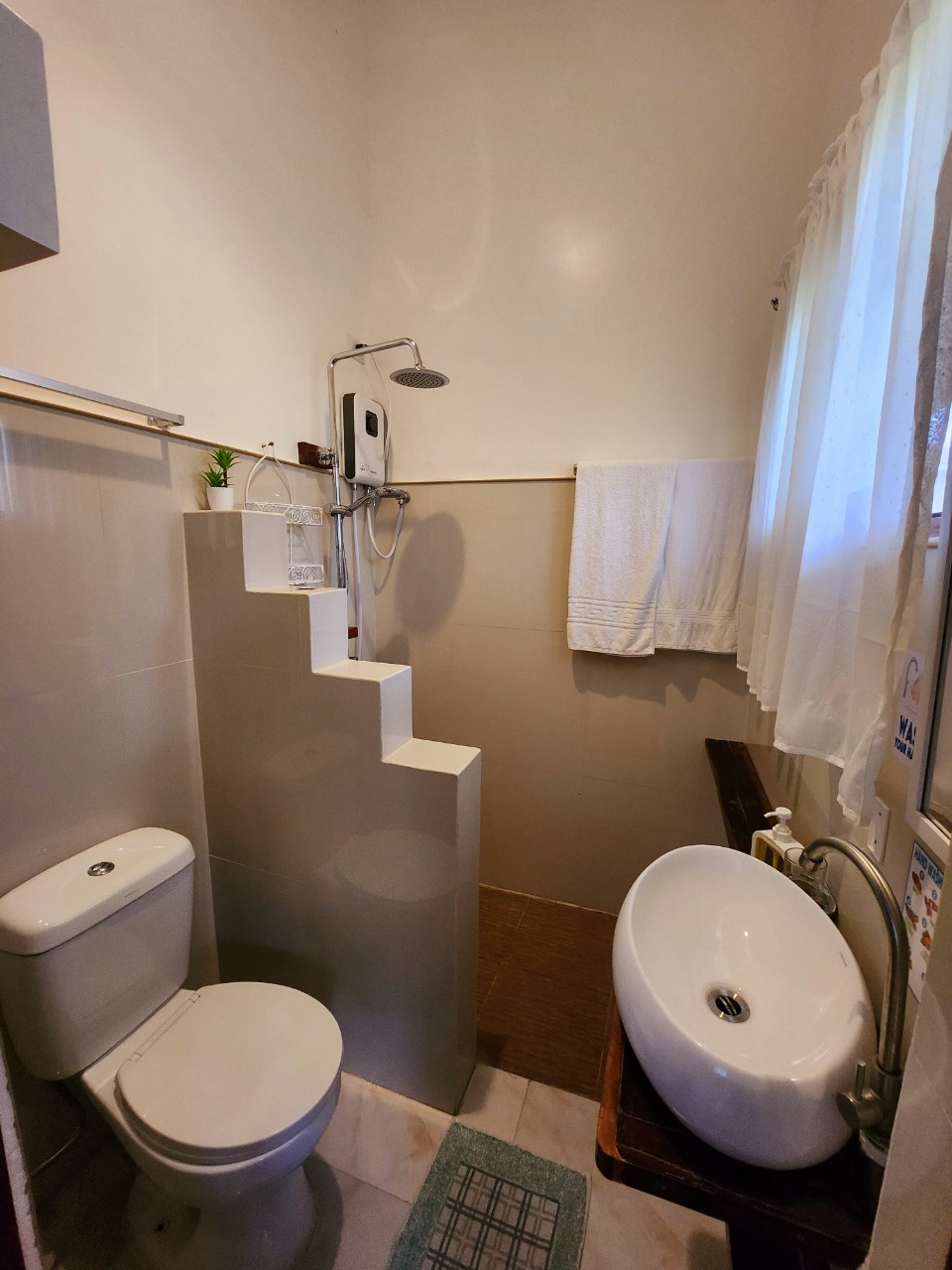 마지막으로 화장실 또한 아주 깔끔했으며, 크지는 않지만 불편하지 않은 동선과 따듯한 물이 잘 나오며 칫솔과 치약등을 무료로 사용할 수 있었습니다. 룸 옆쪽으로는 서핑하고 돌아왔을 때 간단히 물샤워와 신발을 닦을 수 있는 수압 높은 샤워시설이 되어있고, 수영복과 슈트를 말릴 수 있는 빨래걸이와 보드 거치대까지 준비되어 있습니다.