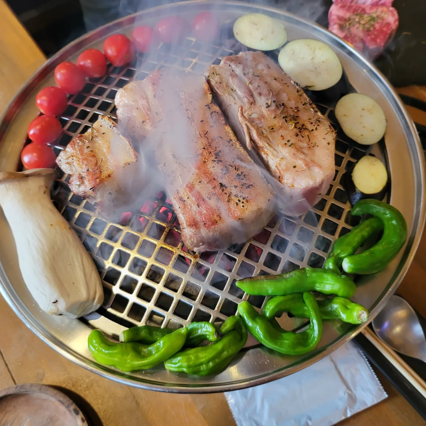 고기는 오겹살부터 굽기 시작했고 버섯과 꽈리고추, 토마토, 가지 구이까지 곁들이니 질리지 않는 고기를 먹을 수 있습니다.