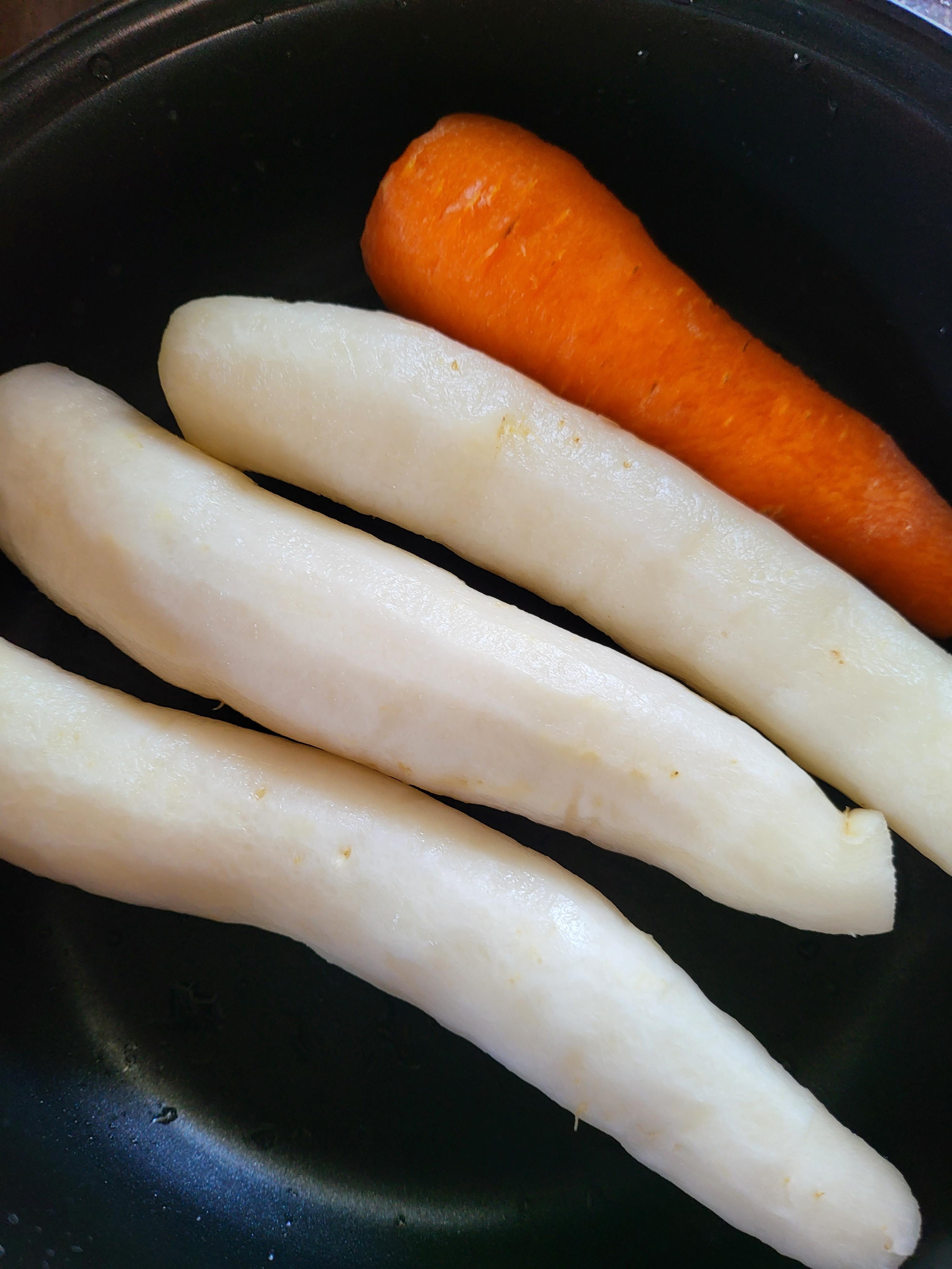 포기김치를 담그고 남은 무로 깍두기를 담갔습니다. 무는 깍둑썰이로 설어 소금에 절여놓고 그동안 밀가루 풀을 만들어 식혔습니다. 소금에 절인 무는 물기를 버리고 채에 올려놓고 그동안 식은 밀가루 풀에 고춧가루, 새우젓, 파, 설탕과 소금으로 간을 맞추고 통에 담아 보관했습니다. 다음날 깍두기도 맛있게 익는 데 성공했습니다.