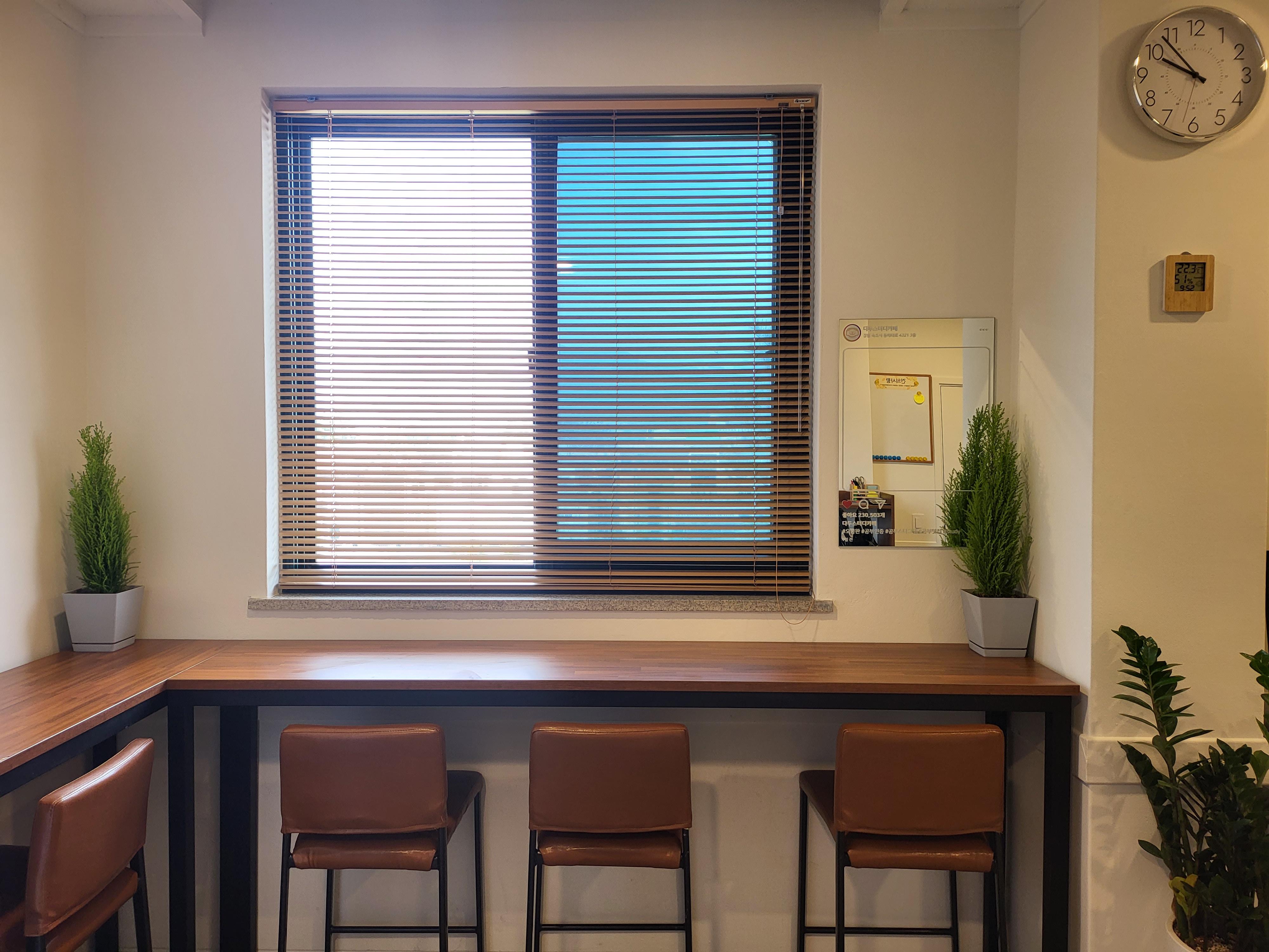 원탁의 모던 미드센츄리 탁자에서 보이는 설악마운틴 뷰도 아주 훌륭합니다. 각 존의 위치마다 방음과 온도, 습도 체크로 열공하기 좋은 다두스터디카페는 오늘도 화창한 날씨와 블라인드사이로 스며드는 햇살들로 따듯한 공간이 되었습니다.