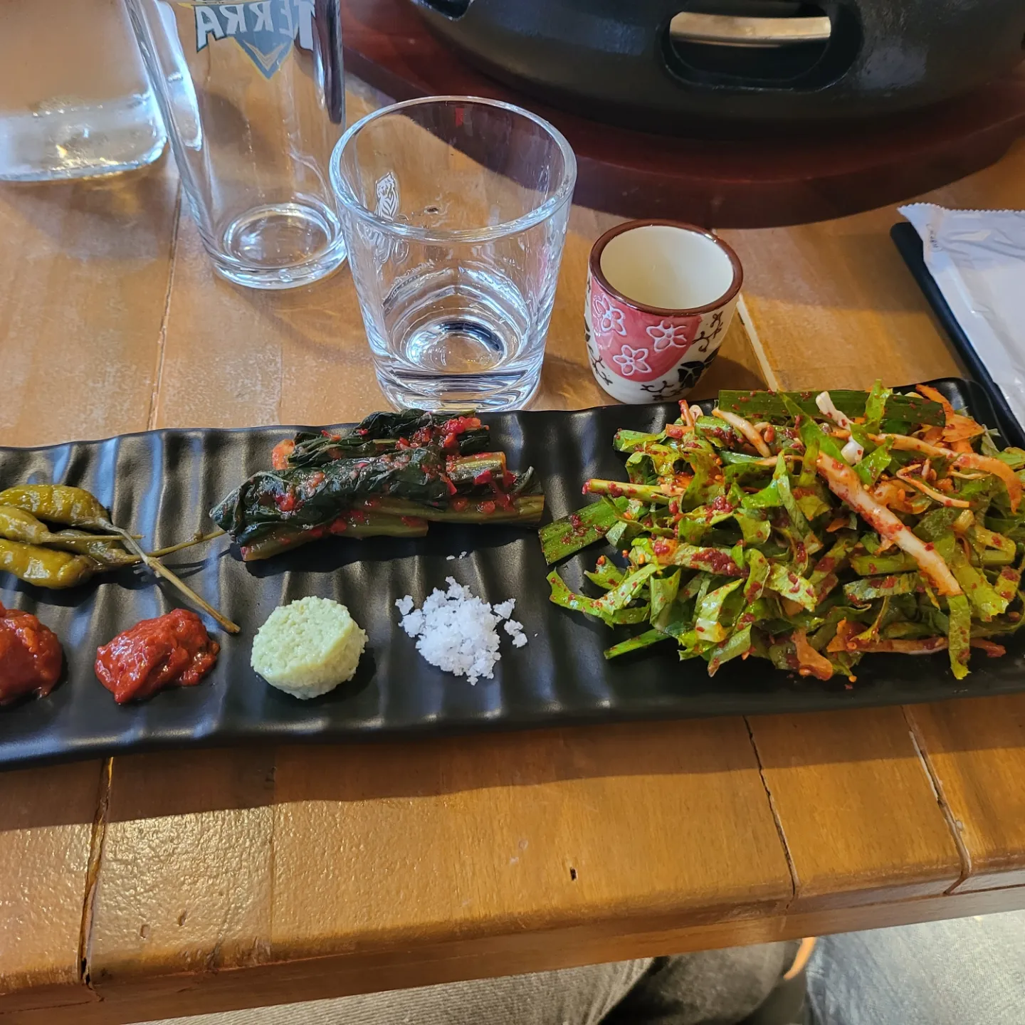 육화주담은 고기 주문과 함께 기본 반찬이 긴 접시 하나에 나오는데, 새콤달콤한 야채무침과 알싸하게 잘 익은 갓김치, 간장절임고추, 쌈장과 오겹살에 찍어먹으면 일품인 갈치속젓, 그리고 한우채끝을 찍어먹는 고추냉이와 깔끔한 소금이 고기들과 아주 잘 어울립니다.
